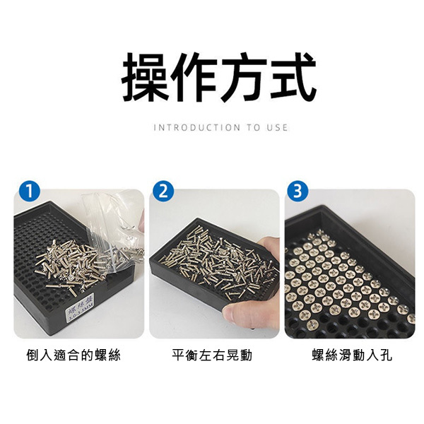 本螺絲盤採用防靜電塑制材料制做,耐磨損,壽命長,並且使用螺絲盤排列螺絲後,電動起子頭直接去螺絲盤中吸取螺絲,人手不用接觸螺絲,有效避免了人手接觸金屬螺絲後使螺絲生鏽的不良後果。