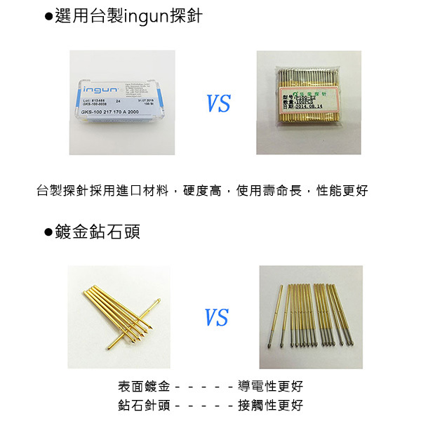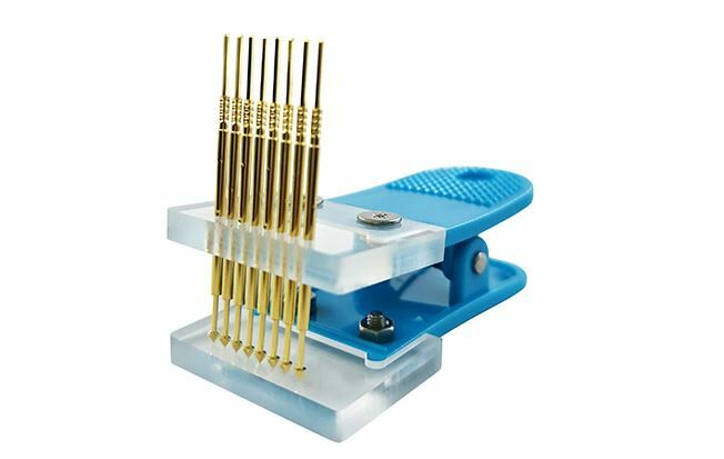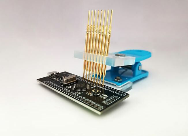燒錄探針夾是一款方便好用的調試工具。它選用台產ingun探針,鍍金鑽石頭,與市面上的一般探針相比,接觸性導電性都更好,且探針材質硬度高,使用壽命更長。在電路板調試和PCB量產時,無須焊接排針,也無須手持,使用起來方便快捷。