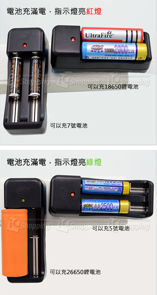 適合各種尺寸鋰離子充電電池,18650/16340,鎳氫/鎳鎘(平頭、凸頭都可以),2號電池,2/3--5/4AA(5#),2/3--5/4AAA(7#),2/3—7/5F6,F8等充電電池。