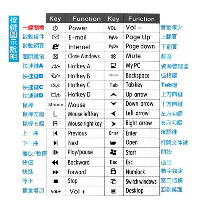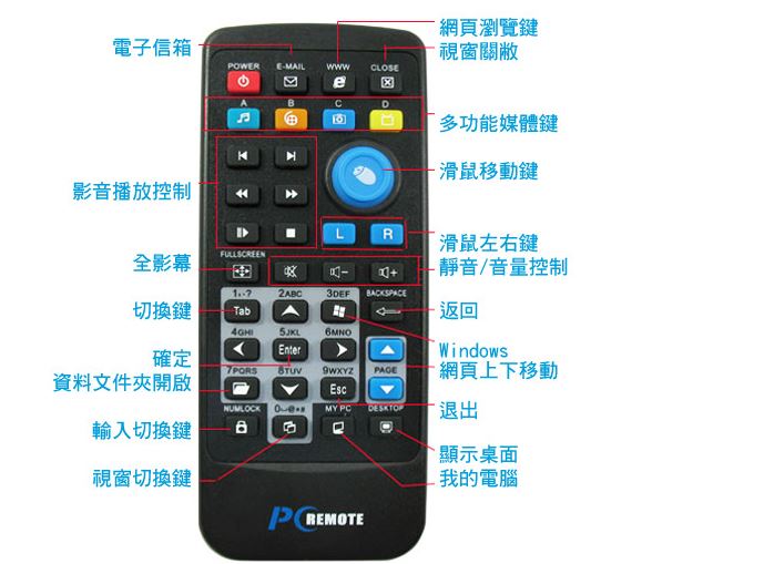 其他按鍵:功能見 附圖:《電腦遙控器按鍵功能圖》