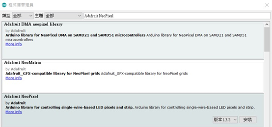 本範例使用之程式庫為 「 Adafruit_NeoPixel」,可至Arduino IDE內的管理程式庫搜尋並安裝。