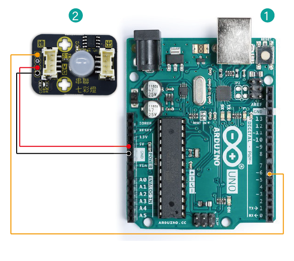 本範例使用 Arduino Uno Rev3(原裝) ,連接Circus Pixel全彩LED模組(球型),每 500 毫秒切換LED燈的顏色。