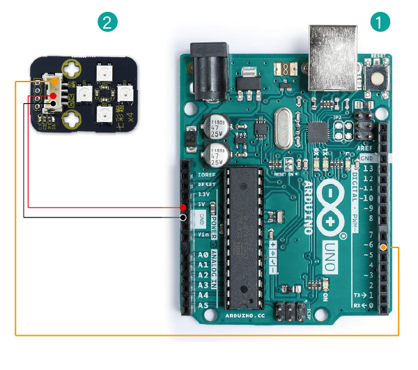 本範例使用 Arduino Uno Rev3(原裝) ,連接Circus Pixel全彩LEDx4模組(晶片),每 500 毫秒切換並點亮一個 LED燈。