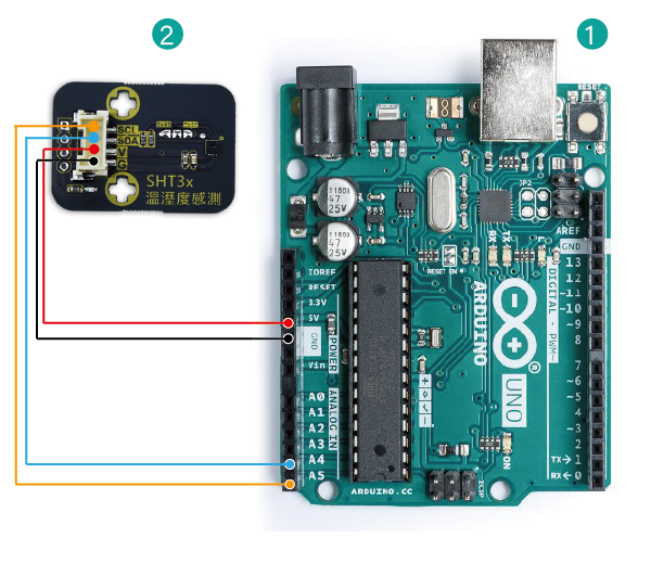 本範例使用 Arduino Uno Rev3(原裝) ,連接Circus SHT3x 溫溼度感測器,每 1秒讀取現場環境「溫度」與「濕度」數值。