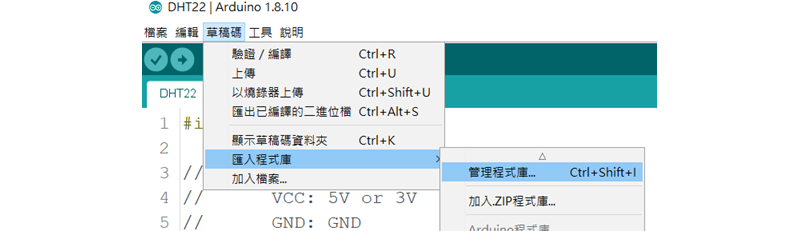 1-2. 開啟 Arduino 的 IDE 介面後,請到上方的功能選項中,點選 「草稿碼」-> 「匯入程式庫」-> 「管理程式庫」。