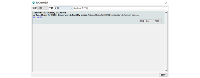 1-3. 在搜尋欄位中,輸入 「Adafruit_SHT31」,找到該項目後便可點擊「安裝」按鈕,開始安裝程式庫。
