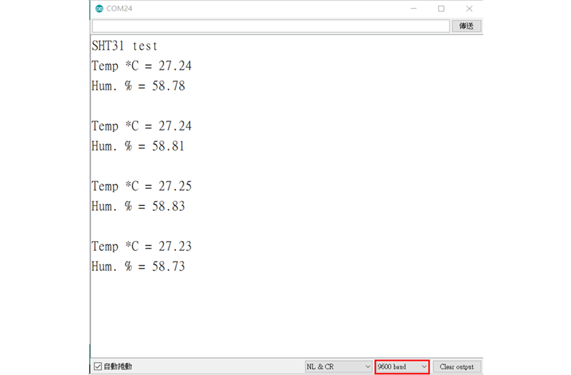 3-2. 確認序列部監控視窗的 baud(紅框處) 是否與程式碼設定的 baud相同。若兩者皆相同即可開始監控數值。