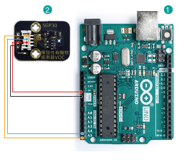 本範例使用 Arduino Uno Rev3(原裝) ,連接Circus 揮發性有機物感測器模組,每 1000 毫秒讀取一次CO2、tTVOC。剛啟動時需要靜置一段時間使感測器啟動,待感測器開始跳動即可偵測。