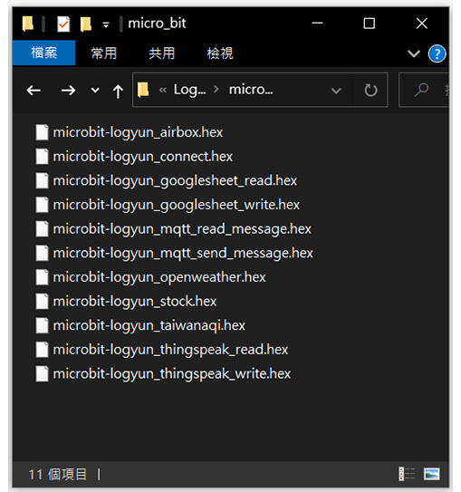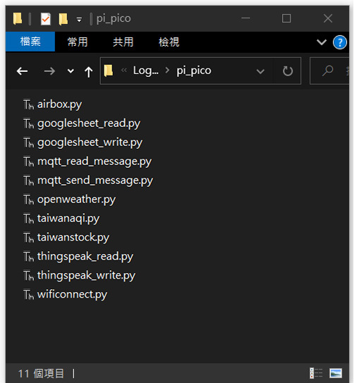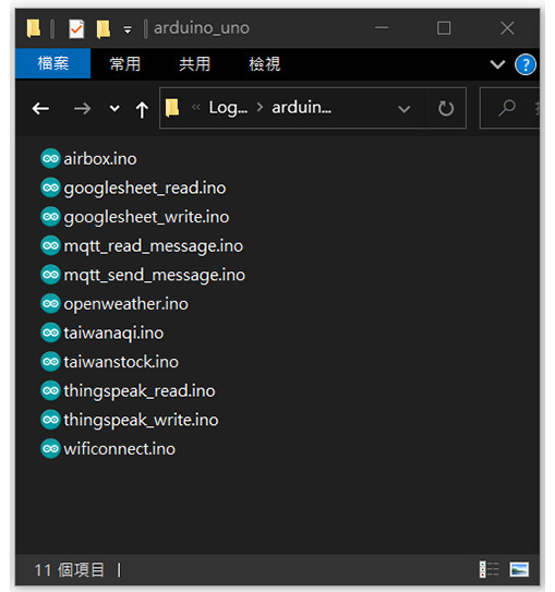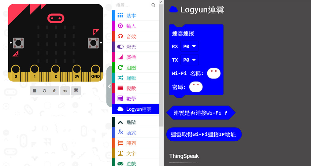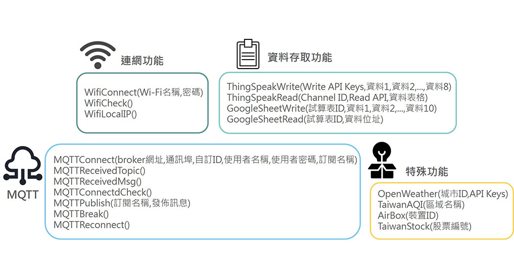 | 功能指令 | WifiConnect(Wi-Fi名稱,密碼) WifiCheck() WifiLocalIP() ThingSpeakWrite(Write API Keys,資料1,資料2,...,資料8) ThingSpeakRead(Channel ID,Read API,資料表格) GoogleSheetWrite(試算表ID,資料1,資料2,...,資料10) GoogleSheetRead(試算表ID,資料位址) MQTTConnect(broker網址,通訊埠,自訂ID,使用者名稱,使用者密碼,訂閱名稱) MQTTReceivedTopic() MQTTReceivedMsg() MQTTConnectdCheck() MQTTPublish(訂閱名稱,發佈訊息) MQTTBreak() MQTTReconnect() OpenWeather(城市ID,API Keys) TaiwanAQI(區域名稱) AirBox(裝置ID) TaiwanStock(股票編號) |