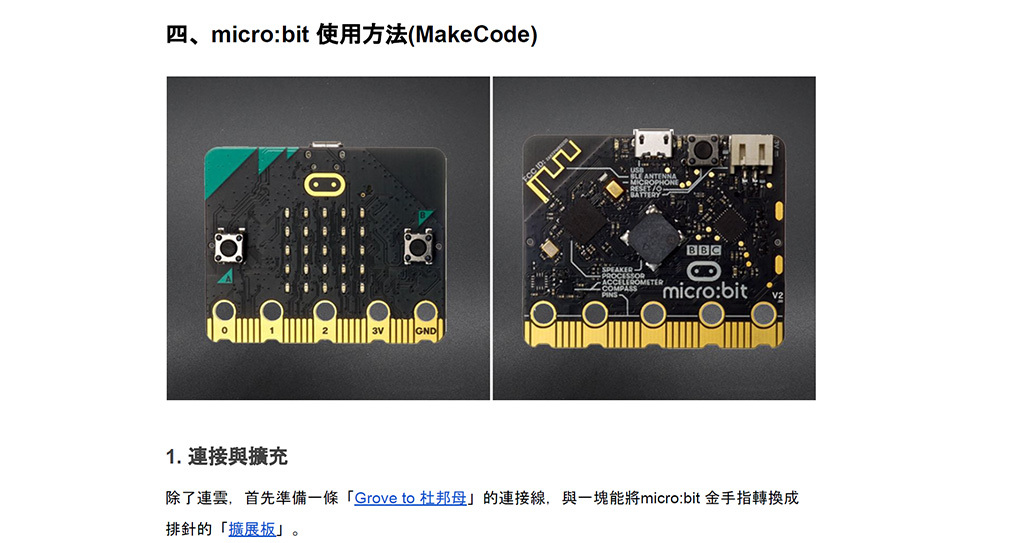 程式庫提供BBC micro:bit 使用的官方編輯器MakeCode 的擴充程式積木,並提供範例程式連結。