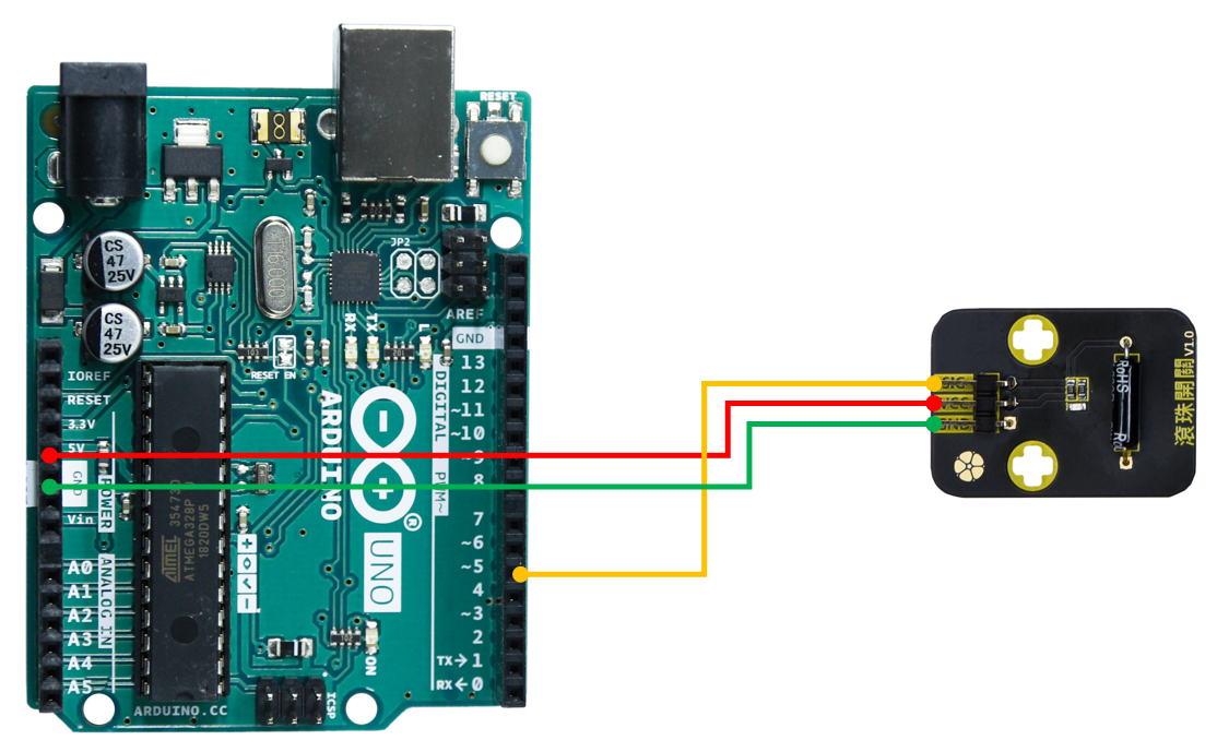 本範例使用 Arduino Uno Rev3(原裝) ,連接Circus 滾珠開關模組,因為此為數位訊號模組,連接時請選擇可以輸入數位訊號的腳位連接,本範例中的訊號腳位設為 「D5」。